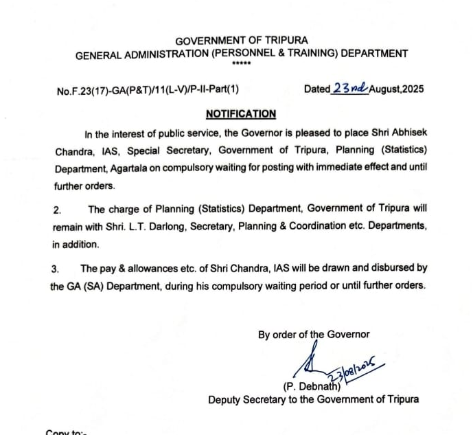 Agartala, 25th August 2025: Tripura Government has placed Shri Abhisek Chandra, IAS, Special Secretary of the Planning (Statistics) Department, on compulsory waiting for posting with immediate effect and until further orders.