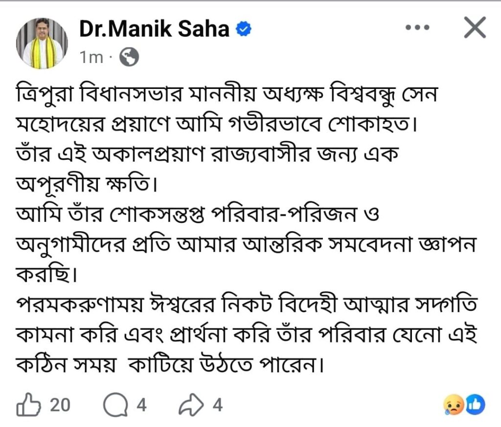 A veteran political leader, Biswa Bandhu Sen was serving as the Speaker of the 13th Tripura Legislative Assembly at the time of his death. He represented the Dharmanagar Assembly constituency in North Tripura district and was elected as a Member of the Legislative Assembly four times.Sen began his political career with the Indian National Congress and was elected twice on its ticket before later joining the Bharatiya Janata Party (BJP).