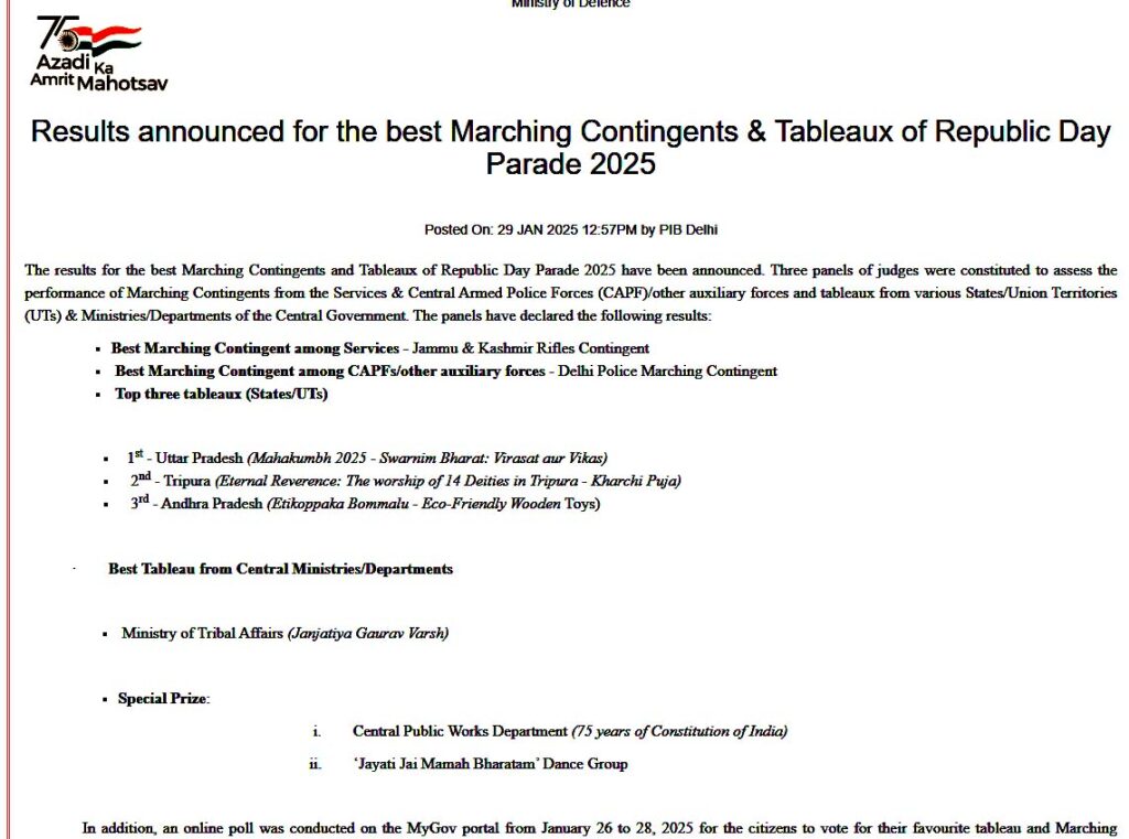 According to an official statement from the Ministry of Defence, the results were determined by three panels of judges who evaluated the performances of Marching Contingents from the Armed Forces and Central Armed Police Forces (CAPFs), as well as tableaux from various States, Union Territories (UTs), and Central Government Ministries/Departments.